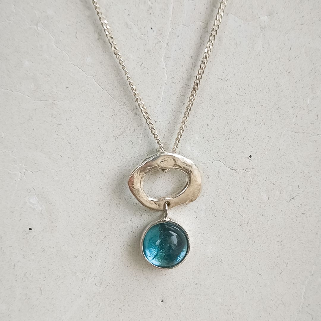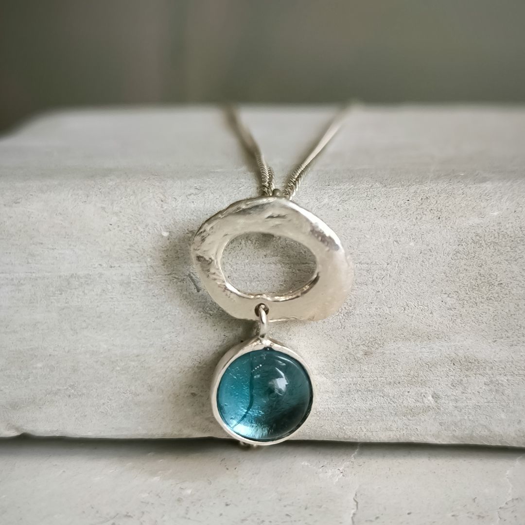 A unique handcrafted silver necklace featuring an organic, textured open circle and a mesmerizing blue topaz gemstone. The irregular shape of the silver loop gives it a natural, earthy feel. Perfect for those who appreciate artistic jewelry with a bohemian touch. This piece is made of high-quality 925 sterling silver, making it an elegant yet versatile accessory for any occasion.